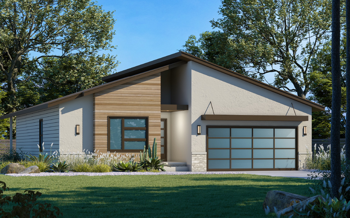 This contemporary rendition of a one-story Cliff May ranch house, allows for a unique and stylish build without the price of a typical custom built home.
